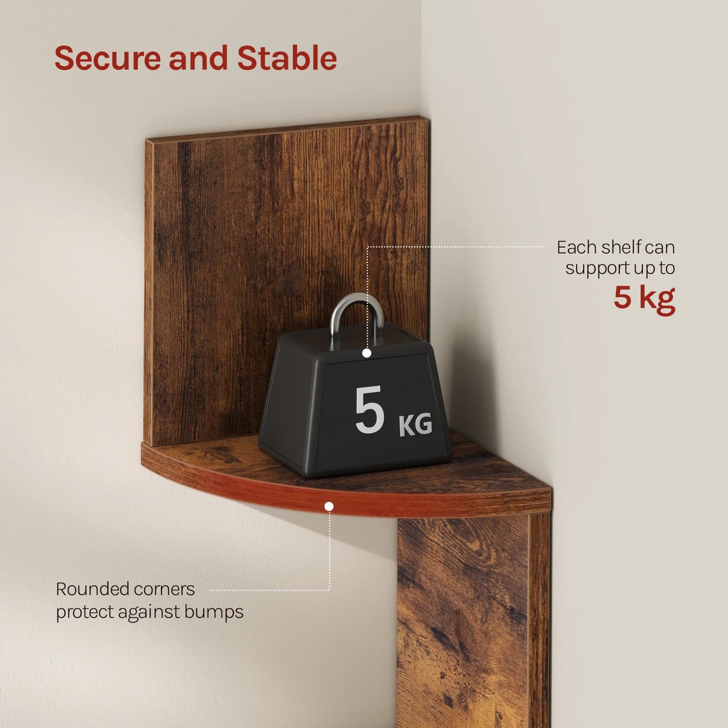 Achter het moderne lijnenspel van deze wandplank met 5 niveaus schuilt een uiterst robuuste constructie. Vervaardigd uit hoogwaardig FSC-gecertificeerd MDF van E1-klasse, is het oppervlak voorzien van een gladde PVC-coating die volledig waterproof en slijtvast is. Dankzij de dubbele wandmontage en de zes onderling verbonden achterpanelen geniet u van een stabiel geheel dat jarenlang meegaat. Elk niveau heeft een draagvermogen van 6 kg, met een totale capaciteit van 15 kg. Dit maakt de plank niet alleen mooi, maar ook uiterst functioneel voor het uitstallen van zwaardere items zoals keukenbenodigdheden of een uitgebreide cd-collectie.