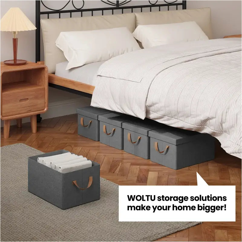 Durch das clevere faltbare Design können Sie die Boxen bei Nichtgebrauch einfach verstauen. Durch Anheben des Metallrahmens können Sie die Box flach zusammenfalten und effizient verstauen, wodurch wertvoller Platz gespart wird. Diese Aufbewahrungsboxen sind ideal für den Einsatz im Schrank, auf einem Regal oder unter dem Bett und passen perfekt in kleine Räume. Ob Sie Kleidung, Bettwäsche oder andere Gegenstände aufbewahren möchten, diese Boxen bieten eine elegante und praktische Lösung für jeden Stauraum