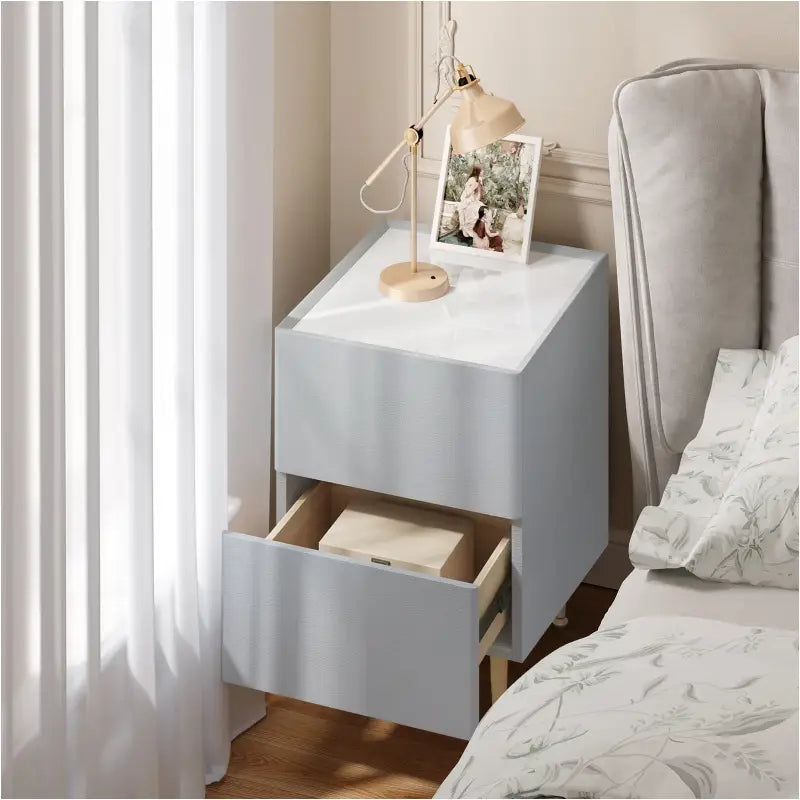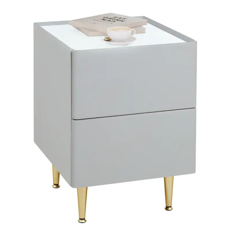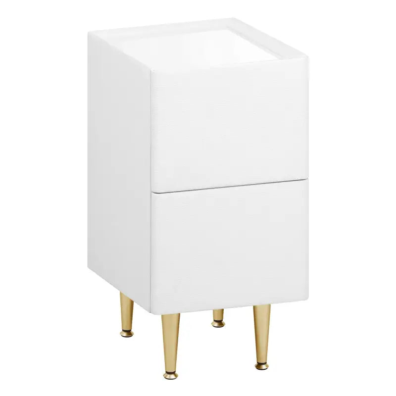 Mit einer breiten Tischplatte und zwei großen Massivholzschubladen, ausgestattet mit Metallschienen für sanftes und geräuschloses Öffnen und Schließen, bietet dieser Nachttisch viel Stauraum für all Ihre Habseligkeiten. Die E1-MDF-Konstruktion und die Metallbeine mit verstellbaren Fußkappen sorgen für Stabilität und können bis zu 30 kg tragen. Darüber hinaus sind die hochglänzende Tischplatte und die weiche PVC-Polsterung leicht zu reinigen und verleihen Ihrem Schlafzimmer einen Hauch von Eleganz.