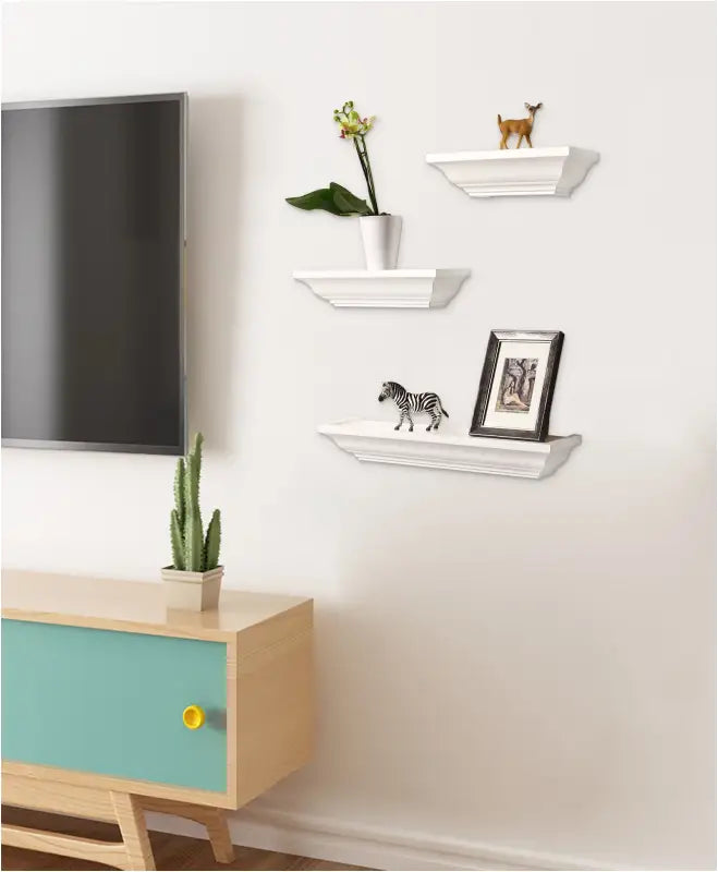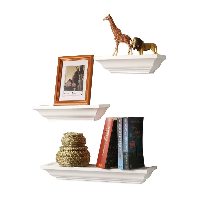 Ajoutez une touche d'élégance à votre intérieur avec l'ensemble de 3 étagères flottantes BukkitBow. Ces belles étagères, fabriquées en bois MDF de haute qualité avec un placage PU respectueux de l'environnement, ont été testées selon la norme E1 et dotées d'une couche de laque blanche mate. Cela les rend résistants à l’humidité, ne se déforment pas facilement et ont une capacité de charge élevée. Le design baroque ajoute une touche classique à n'importe quelle pièce et les différentes tailles offrent une polyvalence pour décorer avec des livres, des CD, des fleurs et d'autres petits objets.