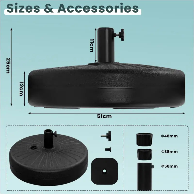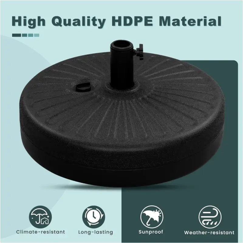 De BukkitBow Vulbare Parasolvoet is uw ideale partner voor zonnige dagen en onverwachte windvlagen. Deze parasolvoet, gemaakt van hoogwaardig HDPE en metaal, is ontworpen om de tand des tijds te doorstaan met een weerstand tegen UV-straling, vocht en slijtage. Met een inhoud van 22 liter biedt deze ronde parasolvoet een stevige ondersteuning voor parasols met een stokdiameter van 38 tot 48 mm. Of u nu ontspant op uw balkon, terras, in de tuin, of geniet op het strand, deze parasolvoet zorgt ervoor dat uw parasol zelfs in winderige omstandigheden stabiel blijft staan.